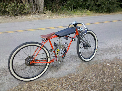 никуя се!!! тэкс... палку прикрутить проволкой к мотору, получим неплохую ножку. Бак - отстой, круть будет если рама будет баком, все равно она у тя пустая и педали выкрутил. Руль стильно провёрнут вниз . Вот не знаю как лучше будет, пять штанов одевать или чего нить придумать на седушку, что бы шары были целы... а можно для адреналину и обострения чувств оставить так